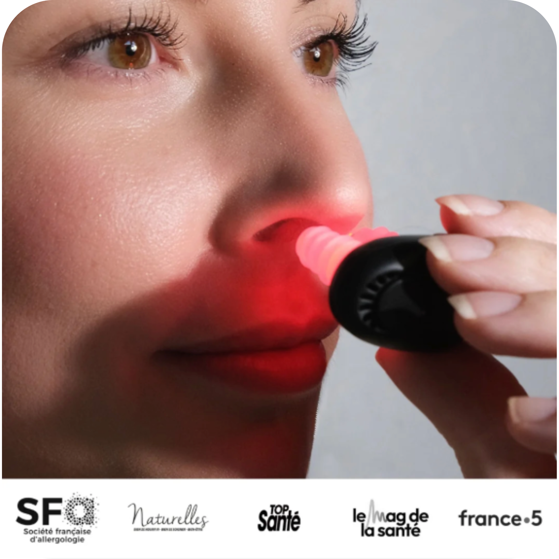 La lumière rouge agit directement sur l’inflammation des muqueuses responsables des éternuements et démangeaisons.