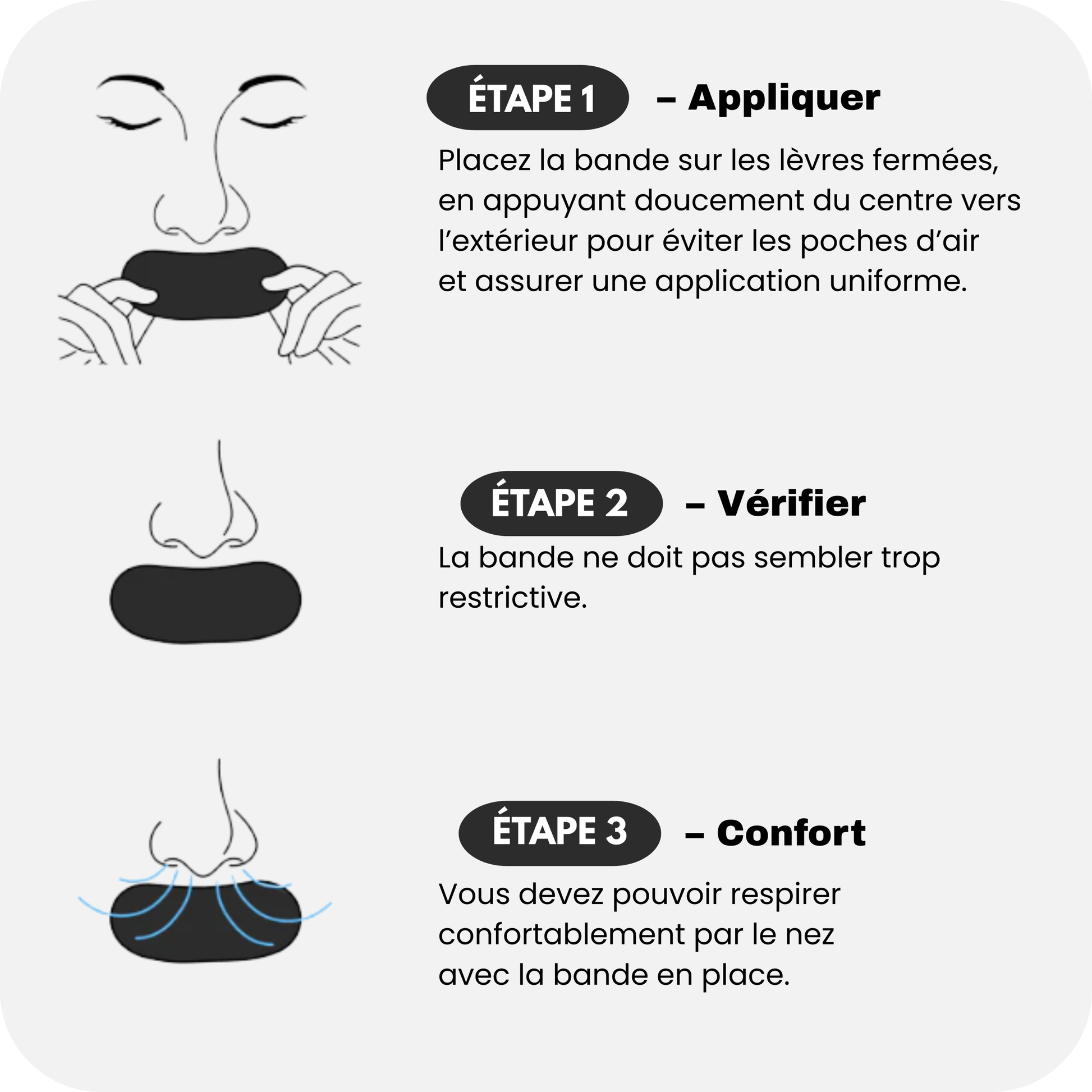 Conseil : Appliquez le patch 15-30 minutes avant de dormir pour vous habituer à la sensation les premières nuits. Assurez-vous que votre peau est propre et sèche (pas de crème de nuit sur la zone des lèvres).